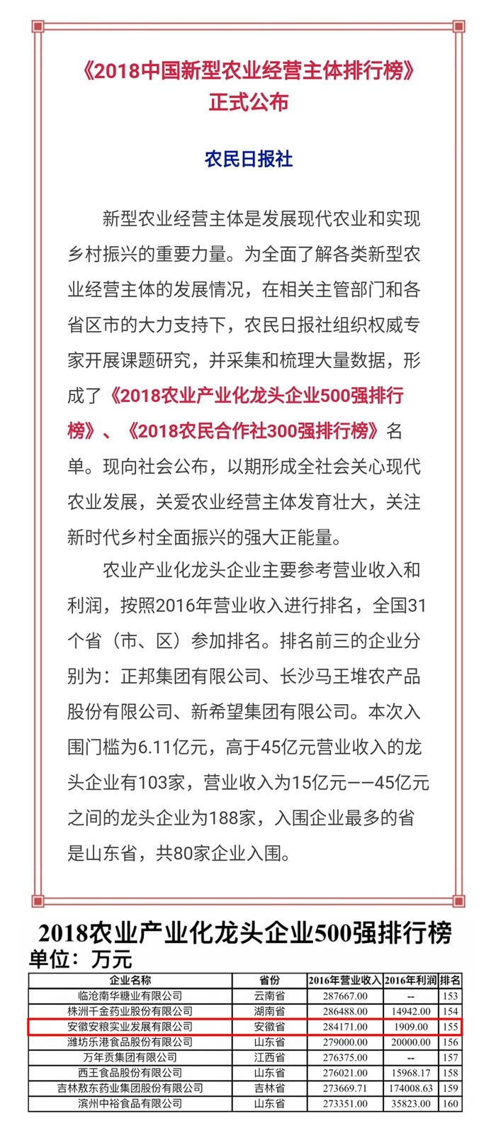 熱烈祝賀安糧實(shí)業(yè)位列《2018農(nóng)業(yè)產(chǎn)業(yè)化龍頭企業(yè)500強(qiáng)排行榜》第155位