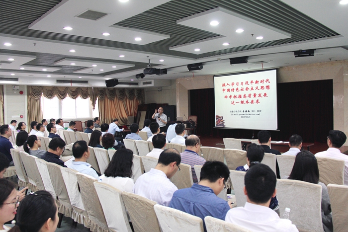 本次報告會邀請了安徽省行政學院黨委委員、副院長袁維海教授主講。袁教授圍繞新時代、新征程、新矛盾、新方略、新舉措、新要求六個方面的內(nèi)容,深入闡釋了習近平新時代中國特色社會主義思想的深刻內(nèi)涵。他通過用大量實例和經(jīng)濟數(shù)據(jù)作支撐,結(jié)合中國經(jīng)濟已從高速增長轉(zhuǎn)向高質(zhì)量發(fā)展并正處于轉(zhuǎn)變發(fā)展方式、優(yōu)化經(jīng)濟結(jié)構(gòu)、轉(zhuǎn)換增長動力的攻關期,全面解讀了黨的十九大報告。其中,對深刻領會新常態(tài)時代這個發(fā)展邏輯進行了系統(tǒng)闡述和深入分析,觀點獨到,給人啟迪,對各單位進一步深入貫徹落實黨的十九大精神,推動安糧集團改革發(fā)展起到了積極作用。