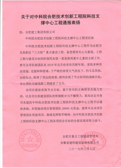 3月8日,由合肥建工六分公司施工管理的中科院合肥創(chuàng)新院科技支撐中心項(xiàng)目,受到建設(shè)單位中科院合肥技術(shù)創(chuàng)新工程院、合肥市重點(diǎn)局、安徽建科監(jiān)理公司下文表彰及重金獎(jiǎng)勵(lì)。