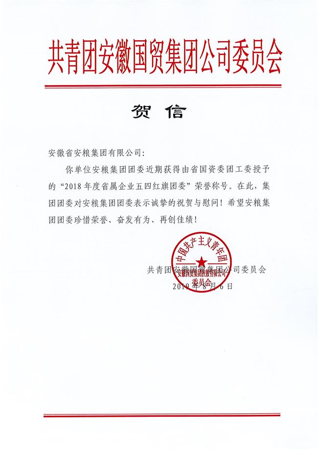 8月6日,國貿(mào)集團團委發(fā)來賀信,安糧集團團委近期再獲殊榮——在省國資委團工委開展的“兩紅兩優(yōu)”評選中被授予“2018年度省屬企業(yè)五四紅旗團委”榮譽稱號。