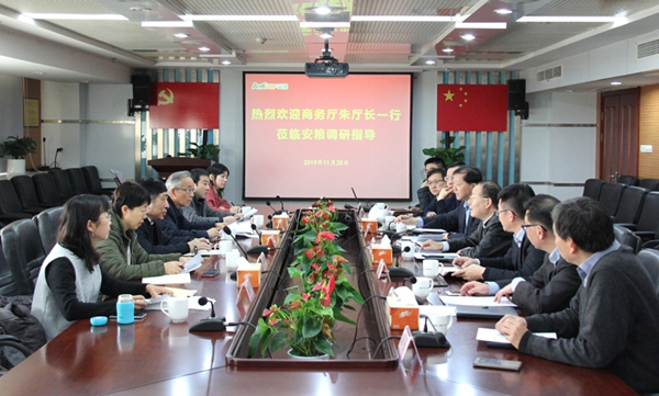 范陽董事長首先代表國貿(mào)集團(tuán)及安糧集團(tuán)對朱丹副廳長一行的到訪表示熱烈歡迎,并簡要介紹了安糧集團(tuán)的基本情況及組織架構(gòu)。安糧集團(tuán)曹訓(xùn)立董事長向朱丹副廳長一行匯報了今年安糧外貿(mào)業(yè)務(wù)經(jīng)營情況、2020年進(jìn)出口形勢預(yù)判及目標(biāo)任務(wù),以及進(jìn)出口業(yè)務(wù)所面臨的問題、外貿(mào)政策建議等情況。公司其他領(lǐng)導(dǎo)則就外貿(mào)便利化、貿(mào)易摩擦、外匯管理、走出去等具體業(yè)務(wù)需求作了補(bǔ)充發(fā)言。