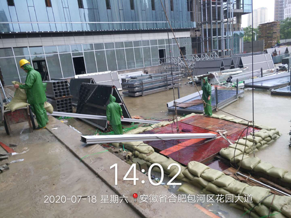 針對(duì)入梅以來嚴(yán)峻的防汛形勢(shì),已交付及在運(yùn)營(yíng)項(xiàng)目積極協(xié)調(diào)物業(yè)公司,共同迎戰(zhàn)強(qiáng)降水天氣。位于合作化路和南二環(huán)交口的安糧國(guó)貿(mào)中心是此次防汛形勢(shì)較嚴(yán)峻的重點(diǎn)項(xiàng)目,特別是降雨量突破合肥市歷史極值的7月18至19日,積水內(nèi)澇直接影響到地下室的安全。險(xiǎn)情出現(xiàn)時(shí),一線人員及時(shí)匯報(bào),各崗位人員在半個(gè)小時(shí)內(nèi)到崗參與排險(xiǎn)工作。項(xiàng)目部對(duì)地庫出入口等易形成倒灌水的危險(xiǎn)區(qū)域安排工作人員堆砌沙袋,打開集水井蓋板,保證積水最大流量的排放。同時(shí)配合唯品會(huì)工作人員啟動(dòng)區(qū)域排水泵,對(duì)易積水難排水區(qū)域進(jìn)行再清理再疏通,隨著南二環(huán)和合作化路積水水位逐漸下降,安糧國(guó)貿(mào)中心順利通過了此次防汛考驗(yàn)。