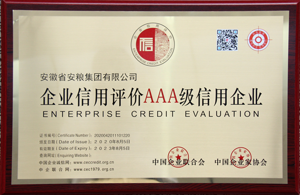 8月20日,中國企業(yè)聯(lián)合會、中國企業(yè)家協(xié)會公布了2020年第一批信用企業(yè)名單,安糧集團首次參評榮獲企業(yè)信用AAA等級認(rèn)證。