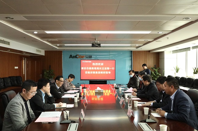 周洪副總裁對王局長一行的到來表示歡迎,并介紹了公司的發(fā)展歷程、業(yè)務板塊及2020年經(jīng)營情況。王局長簡要介紹了泰安市發(fā)展情況以及當?shù)靥厣a(chǎn)品,提出希望發(fā)揮雙方平臺優(yōu)勢,拓寬與安糧集團的合作空間。雙方與會人員就農(nóng)產(chǎn)品研發(fā)、產(chǎn)業(yè)化建設及推動當?shù)赝庀蛐徒?jīng)濟發(fā)展等方面展開了深入的交流討論。