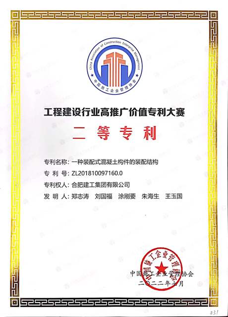 7月29日,中國施工企業(yè)管理協(xié)會公布了“第二屆工程建設行業(yè)高推廣價值專利大賽”評選結(jié)果,合肥建工“一種裝配式混凝土構(gòu)件的裝配結(jié)構(gòu)”發(fā)明專利榮獲大賽二等獎。