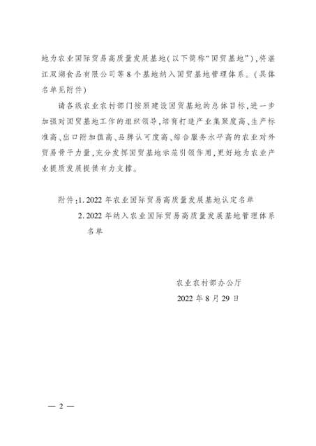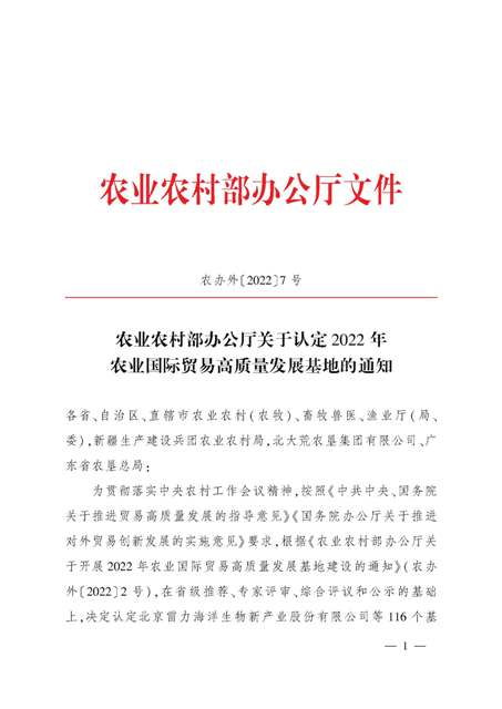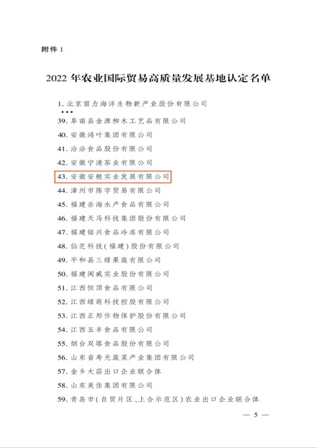 日前,農(nóng)業(yè)農(nóng)村部發(fā)布了《關(guān)于認(rèn)定2022年農(nóng)業(yè)國際貿(mào)易高質(zhì)量發(fā)展基地的通知》,經(jīng)省級推薦、專家評審、綜合評議和公示,認(rèn)定安徽安糧實業(yè)發(fā)展有限公司等116個基地為2022年農(nóng)業(yè)國際貿(mào)易高質(zhì)量發(fā)展基地。
