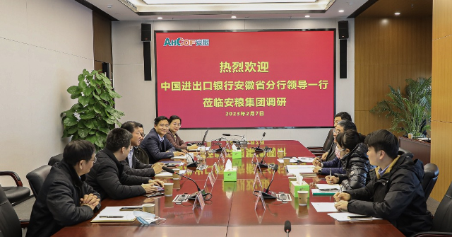 2023年2月7日,中國(guó)進(jìn)出口銀行安徽省分行武建軍行長(zhǎng)、王宇輝副行長(zhǎng)等一行到公司調(diào)研。安糧集團(tuán)、安糧控股公司領(lǐng)導(dǎo)曹訓(xùn)立、周洪、楊榮山、程松林及相關(guān)部室負(fù)責(zé)人熱情接待了武行長(zhǎng)一行并舉行座談。