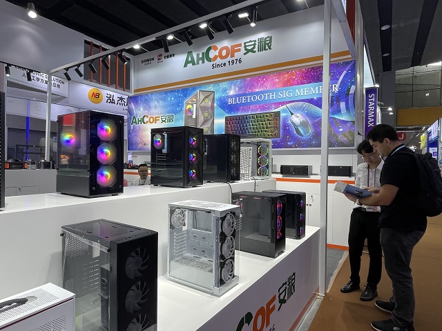 南方一部在本屆廣交會(huì)一期主要參展游戲電腦機(jī)箱產(chǎn)品,從入門級到高端游戲機(jī)箱齊全。部門在營銷展示上采用一系列新穎的形式,展臺(tái)的主通道采用目前比較流行的魚缸游戲機(jī)箱作為看點(diǎn),用可藍(lán)牙連接手機(jī)和電腦的高端游戲機(jī)箱吸引客戶。為了突出參展效果,所有游戲機(jī)箱都裝上了RGB變色風(fēng)扇。多樣化的變色風(fēng)扇與南方二部的機(jī)械鍵盤吸引了大量客戶駐足觀看。消費(fèi)電子展6個(gè)攤位,突出游戲類產(chǎn)品的裝修風(fēng)格,搭配大氣的門頭、顯眼的海報(bào)燈箱,使客戶在進(jìn)館時(shí)只需一眼就能夠鎖定目光。