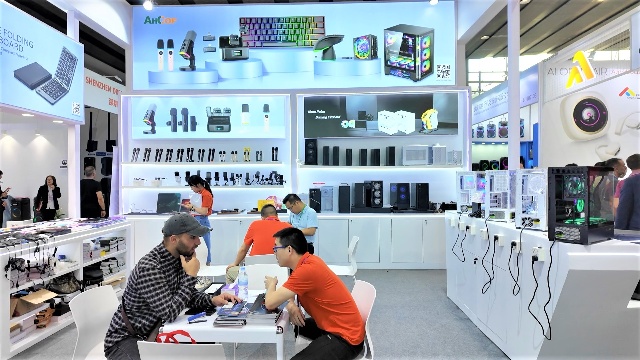 電子消費品類展區(qū),安糧推出了不同款式的散熱機箱,再加上融入人體工程學設計的配套鍵鼠,能滿足不同PC DIY的需求。此外,大容量、多接口、充電快的移動電源,也引得不少意向客戶紛紛下訂