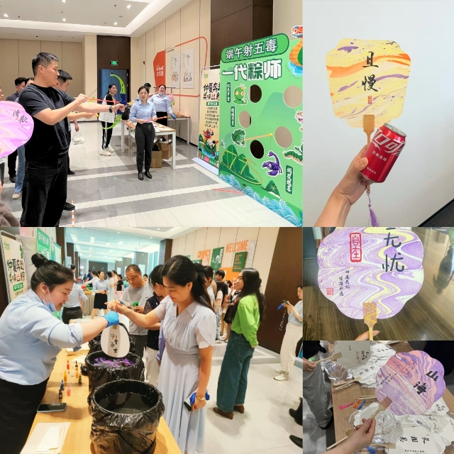 5月29日,在公司餐廳開展的“仲夏奔赴?美味出粽”端午趣味活動,吸引了眾多員工熱情參與?;顒蝇F(xiàn)場最具人氣的“端午射五毒”游戲,參與者手持弓箭瞄準背景板上的蛇、蝎等“五毒”圖案,在體驗傳統(tǒng)民俗競技樂趣的同時,寄托驅邪避毒、祈福安康的心愿。同步開展的非遺漆扇制作活動讓員工通過親手創(chuàng)作進一步深化對非遺文化的認知。成品扇子上,“山?!薄盁o憂”“且慢”等字樣與端午元素、傳統(tǒng)書法相映成趣。